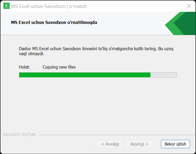 - Shundan soʻng dastur ilovani kompyuteringizga oʻrnatadi. Bunda sizdan faqat oʻrnatish jarayoni yakunlanishini kutish talab etiladi xolos.
