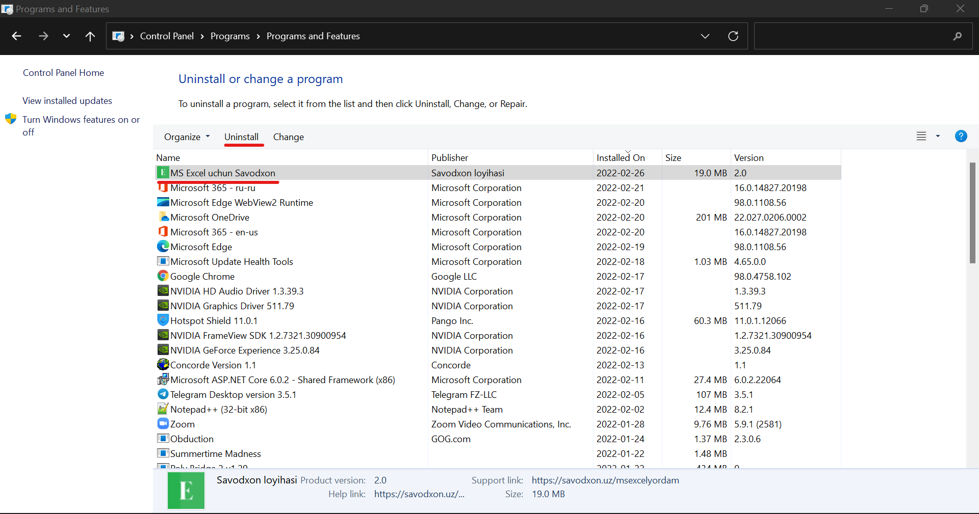 - Ochilgan roʻyxatda Savodxon ilovasini toping, uni belgilang va "Удалить" ("Uninstall") tugmasini bosing. Shu bilan ilova kompyuteringizdan oʻchiriladi.