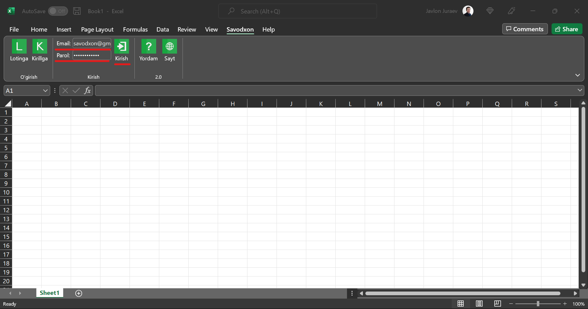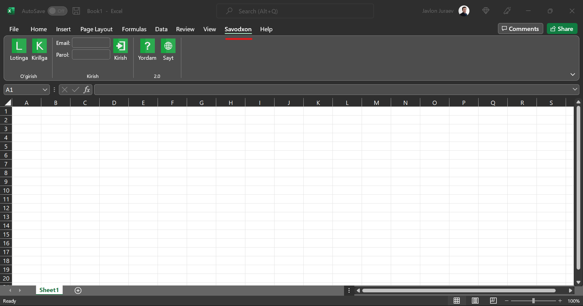 - Ilova kompyuteringizga muvaffaqiyatli oʻrnatilgandan soʻng, MS Excel dasturini ochsangiz — uning asosiy menyusida “Savodxon” deb nomlangan yangi boʻlim paydo boʻlganini koʻrasiz. Shu boʻlimga oʻtsangiz, ilova tugmalari koʻrinadi.