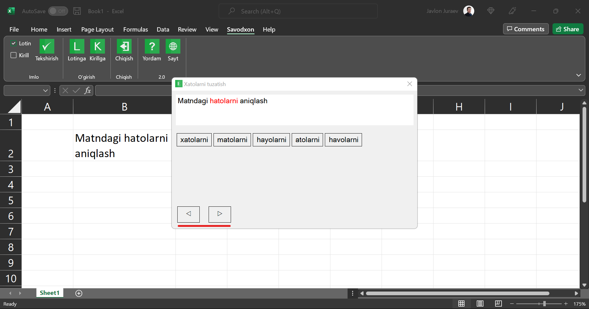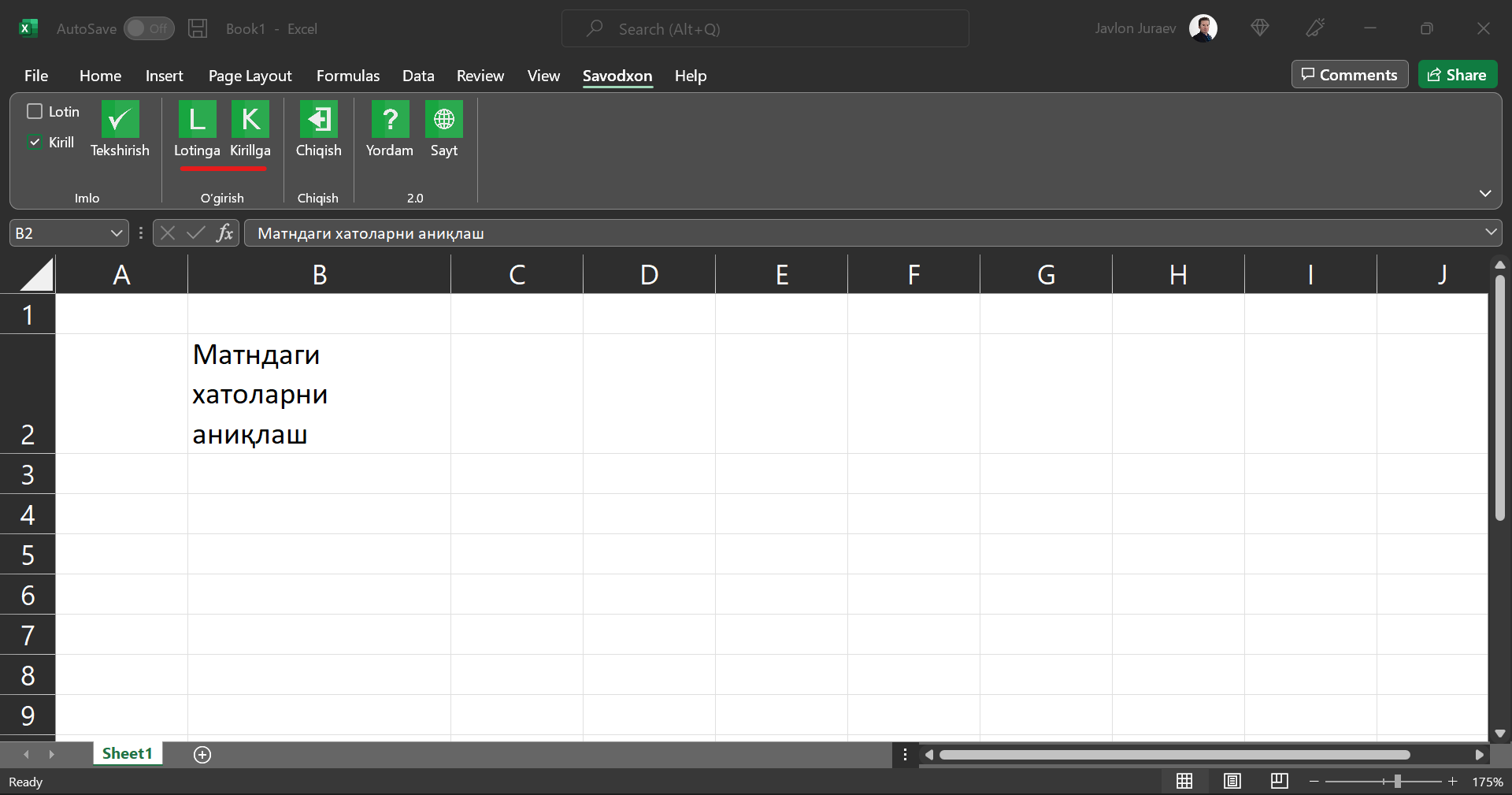 Ushbu ilova yordamida siz Savodxon xizmatlaridan bevosita Microsoft Excel dasturi ichida turib foydalana olasiz. Ilovaning eng soʻnggi versiyasini quyidagi tugma orqali yuklab olishingiz mumkin: