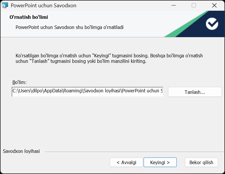 - Keyingi sahifada sizga ilovani qayerga oʻrnatishni tanlash taklif etiladi. Ilova bexato ishlashi uchun avvaldan belgilab qoʻyilgan manzilga oʻrnatishni tavsiya qilamiz. Shunchaki, “Keyingi” tugmasini bosing.