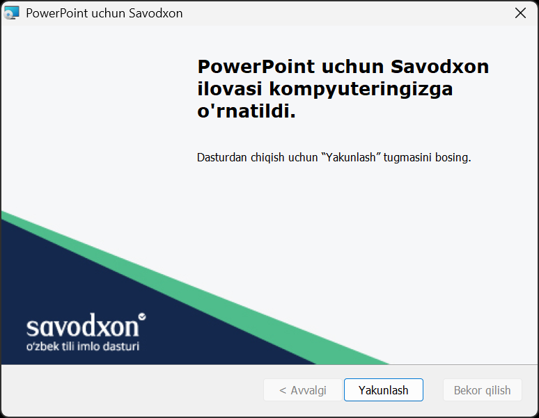 Ushbu ilova yordamida siz Savodxon xizmatlaridan bevosita Microsoft PowerPoint dasturi ichida turib foydalana olasiz. Ilovaning eng soʻnggi versiyasini quyidagi tugma orqali yuklab olishingiz mumkin: