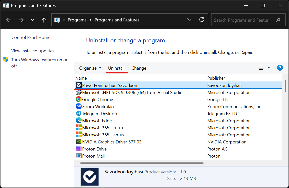 - Ochilgan roʻyxatda Savodxon ilovasini toping, uni belgilang va "Удалить" ("Uninstall") tugmasini bosing. Shu bilan ilova kompyuteringizdan oʻchiriladi.