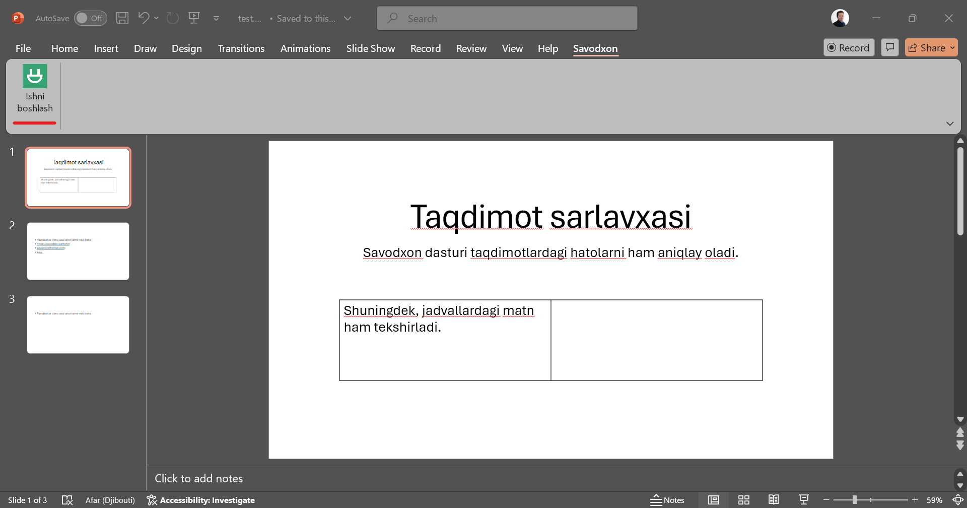 - Ilova kompyuteringizga muvaffaqiyatli oʻrnatilgandan soʻng, MS PowerPoint dasturini ochsangiz — uning asosiy menyusida “Savodxon” deb nomlangan yangi boʻlim paydo boʻlganini koʻrasiz. Shu boʻlimga oʻtsangiz, “Ishni boshlash” tugmasini koʻrasiz. Ilova ishini shu tugmaga bosish bilan boshlaysiz.