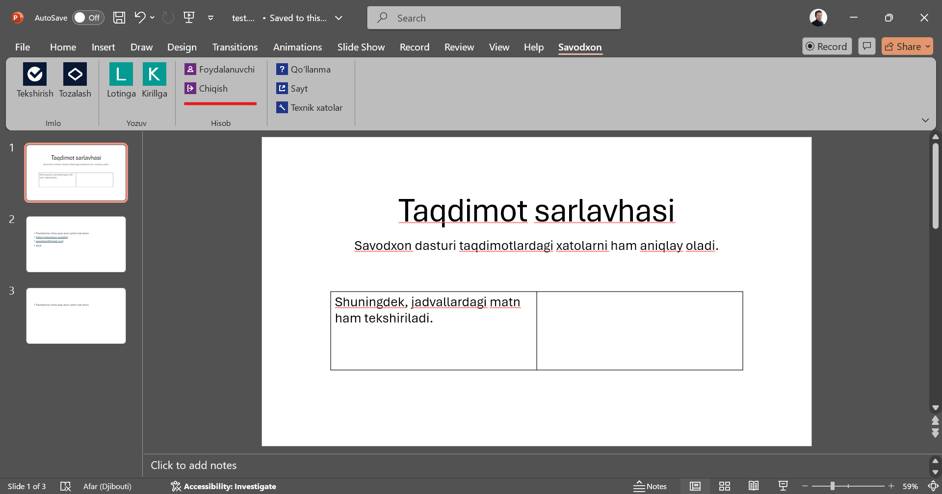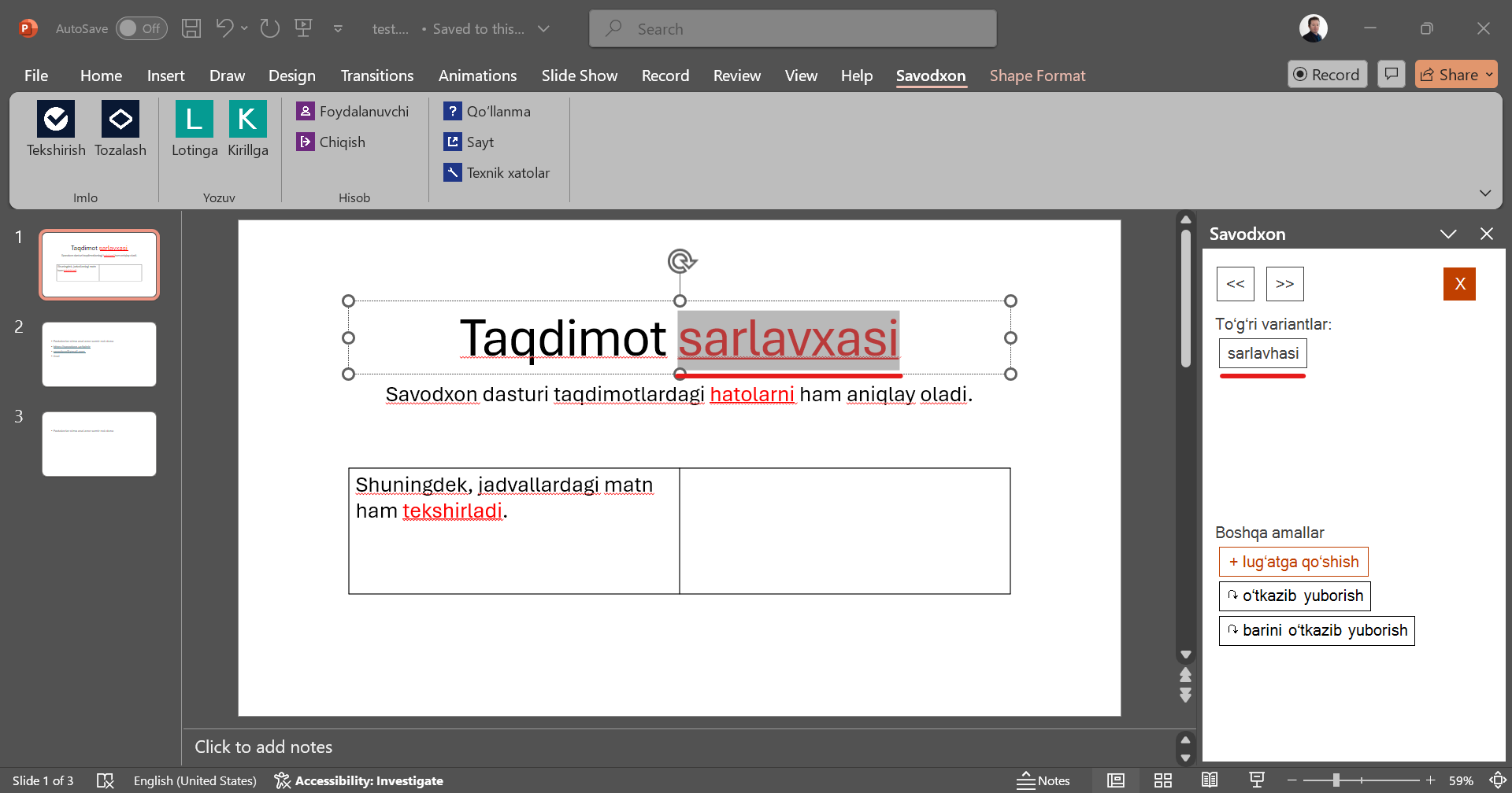 - Taqdimotdagi matnda mavjud imlo xatolarini aniqlash uchun “Tekshirish” tugmasini bosing. Agar taqdimotning faqat bir qismini tekshirmoqchi boʻlsangiz, kerakli slaydlarni belgilab, keyin “Tekshirish” tugmasini bosing.